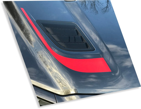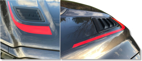 The stripes are precut and meticulously designed to the shape of the hood lines. These fit on the hood just below and to the side of the hood vent.