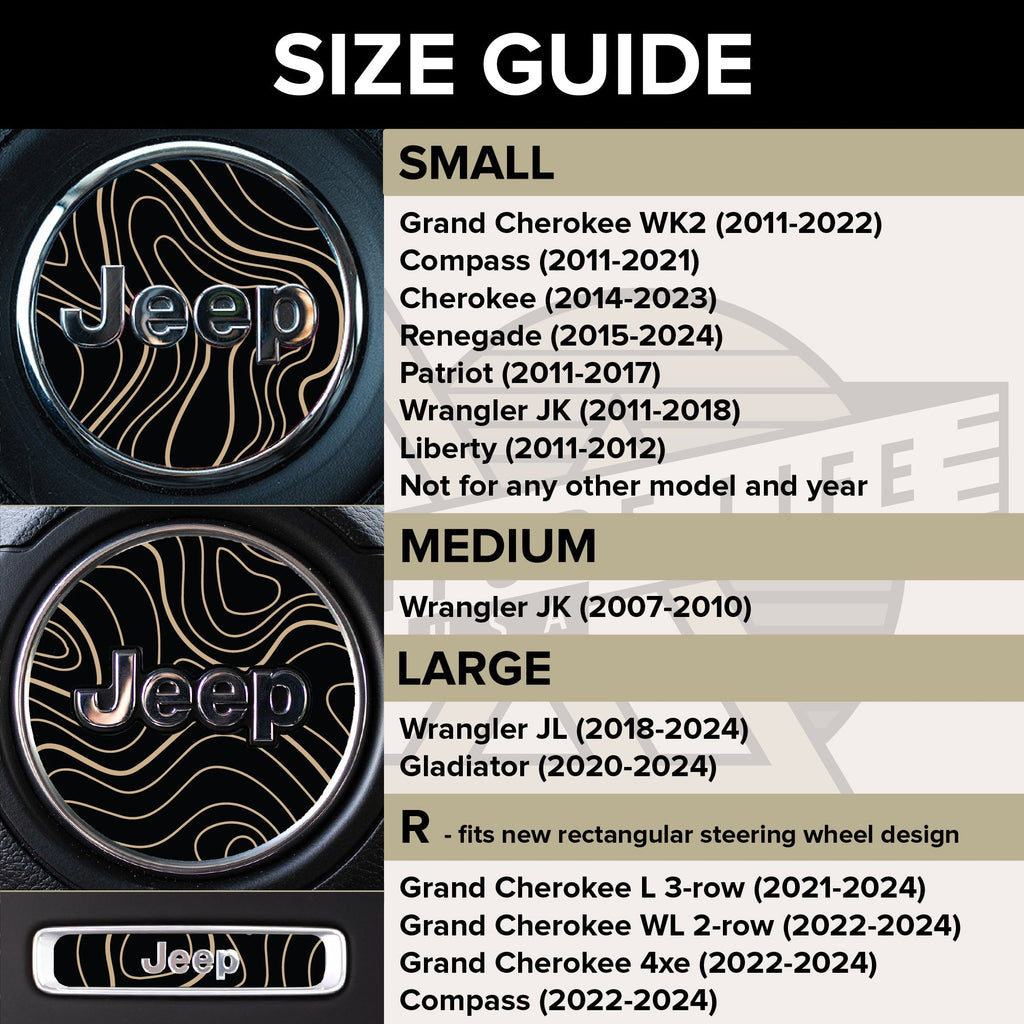 Customize your interior with this matte black with gloss black topo design premium decal that is precisely cut and intentionally designed to fit directly onto your factory steering wheel around the interior emblem.