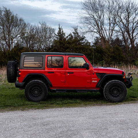 (2) Pre-Cut Window Graphics for Driver and Passenger sides. Clear Window Vinyl with Black Flag Print